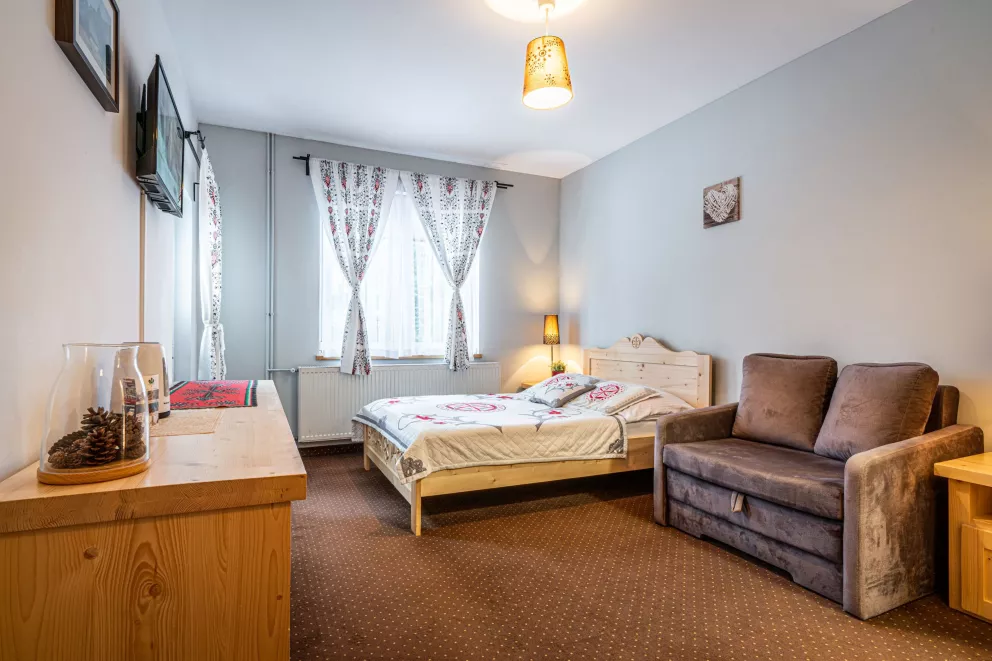 Klimatyczne i funkcjonalne pokoje 3-osobowe z łazienkami posiadają łoże oraz pojedyncze łózko lub rozkładaną kanapę.
