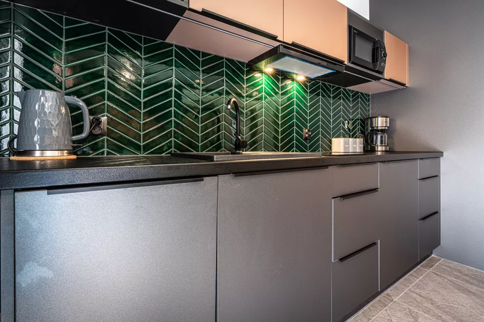 Każdy z apartamentów posiada salon z aneksem kuchennym wyposażonym w: